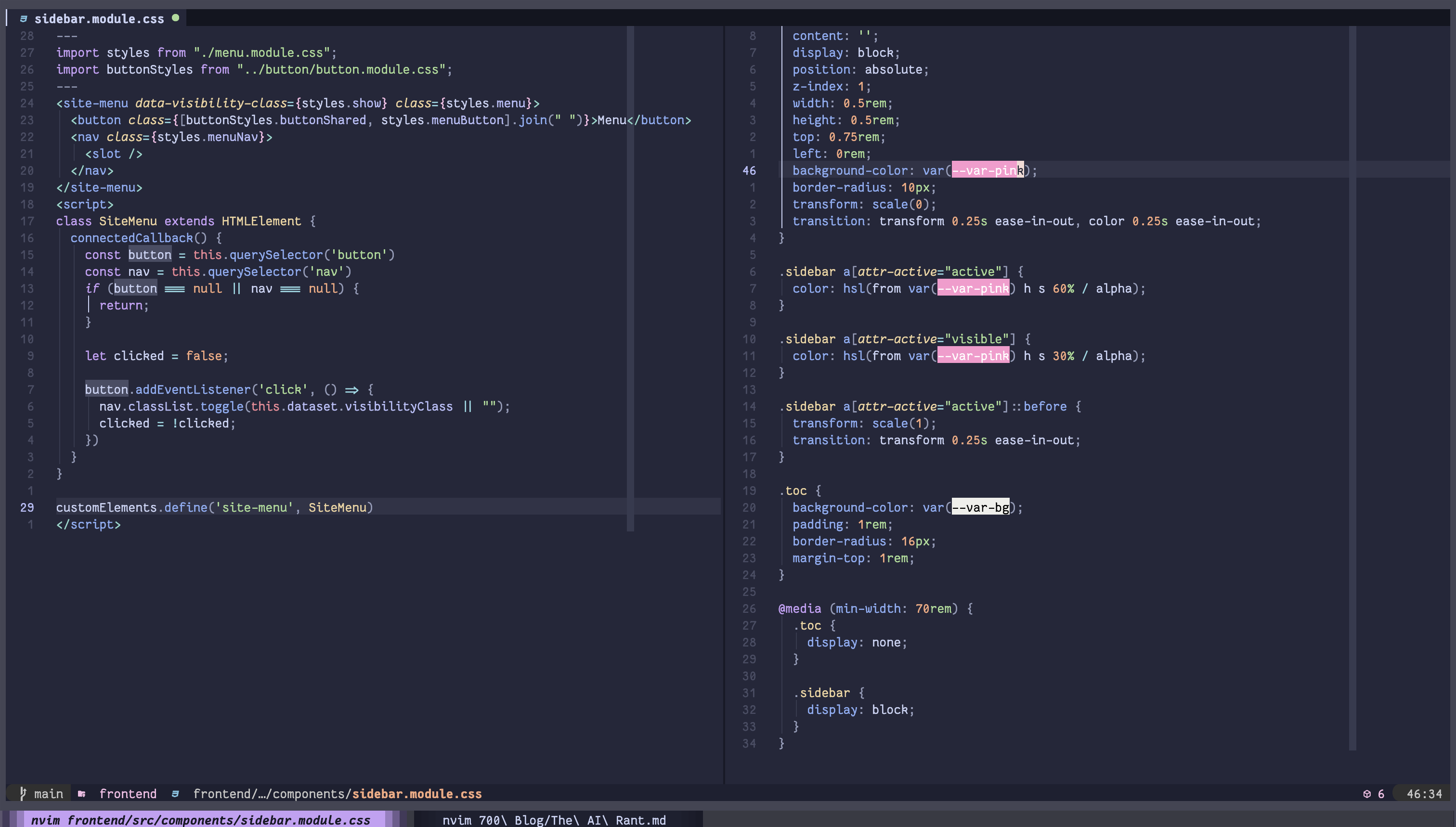 Editing code in Neovim feels really comfortable for me! It already works pretty well out of the box, and then there's a really good ecosystem of plugins that make it even better. Neovim supports the Language Server Protocol, a standard way for text editors to talk with servers that provide information about the code being edited. This includes formatting, finding symbols (variables and function names) and where things are defined and used. TreeSitter is a library built into Neovim that lets it build Abstract Syntax Trees. This means that the library is able to take a piece of code, parse it and understand hierarchy, symbols and the general flow of the code. The "tree" it creates is this big list of all the different symbols and any sub-symbols. This lets Neovim set syntax highlighting, and what the code actually means, so that you can easily jump around it with your fancy Vim key movements. The image below shows some Typescript code, with the syntax tree printed on the right hand side.